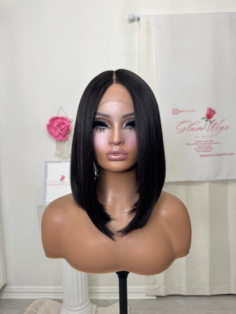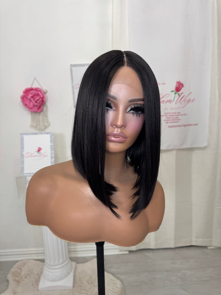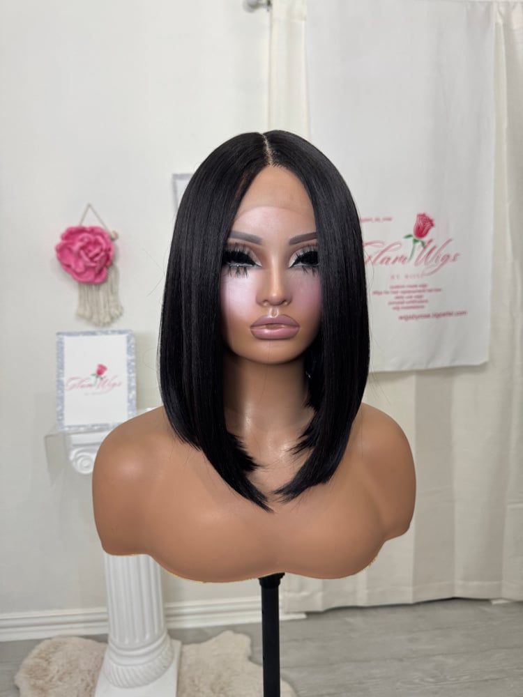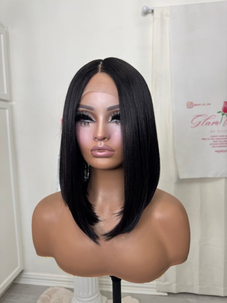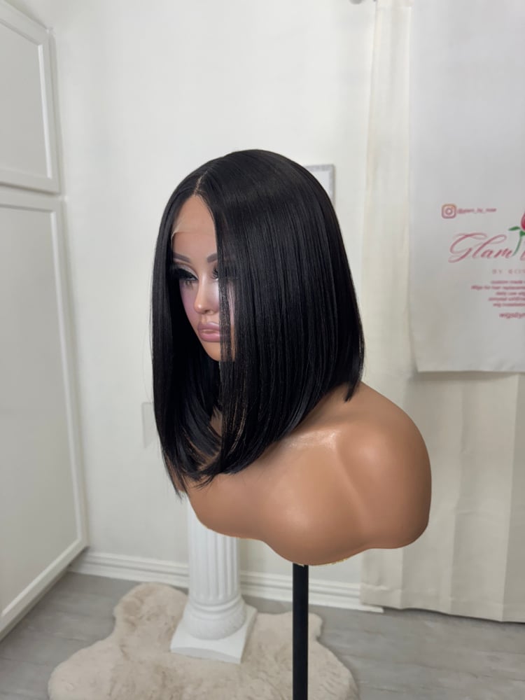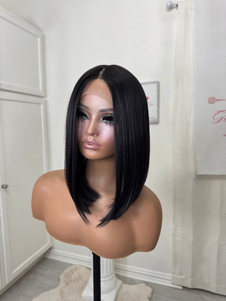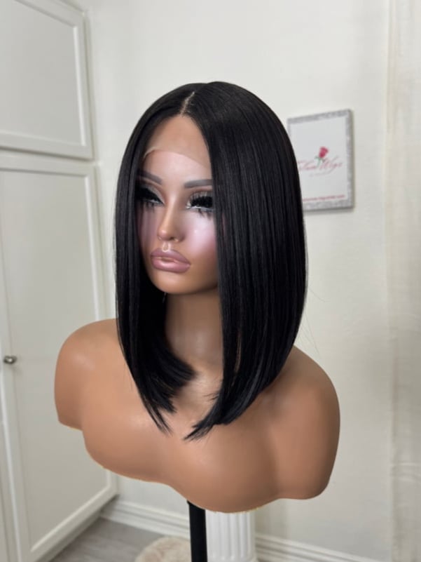 A line cut glueless bob t part lace front natural hairline, one size fits all stretch breathable cap with combs and adjustable straps. Luxury synthetic and human hair blend, natural hair feel soft silky hair, 12 inch bob, final sale item.