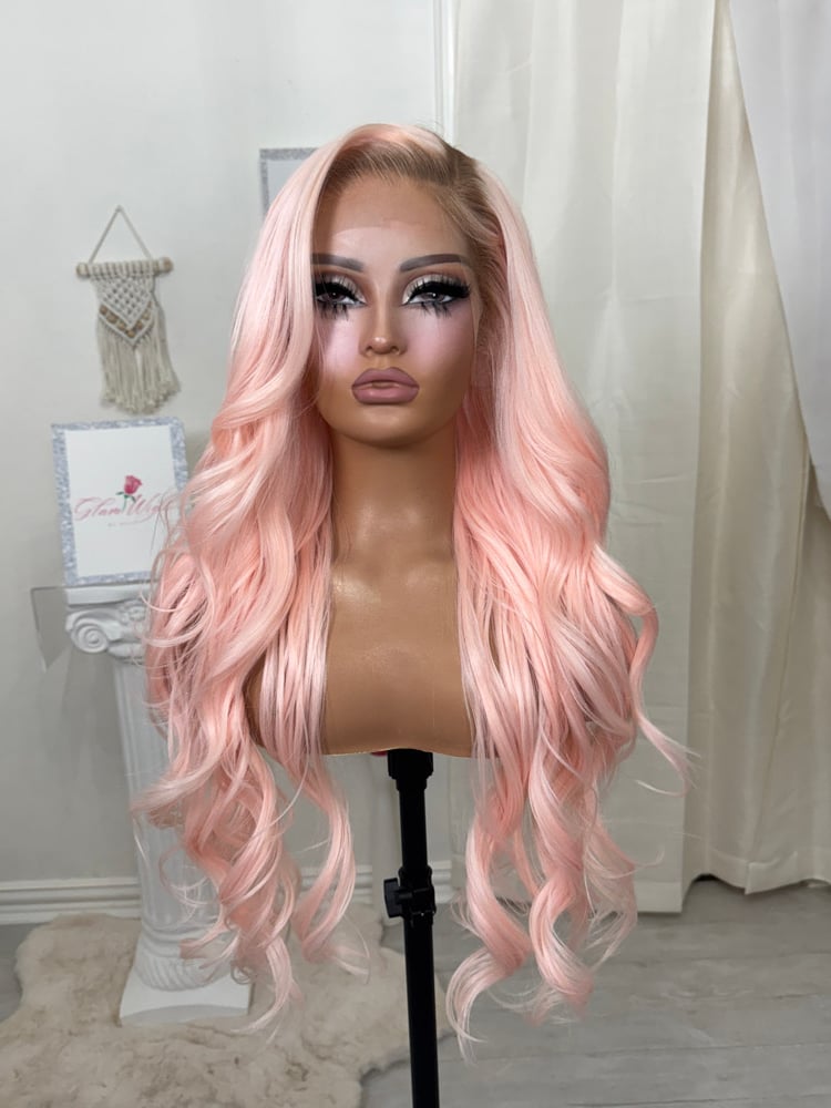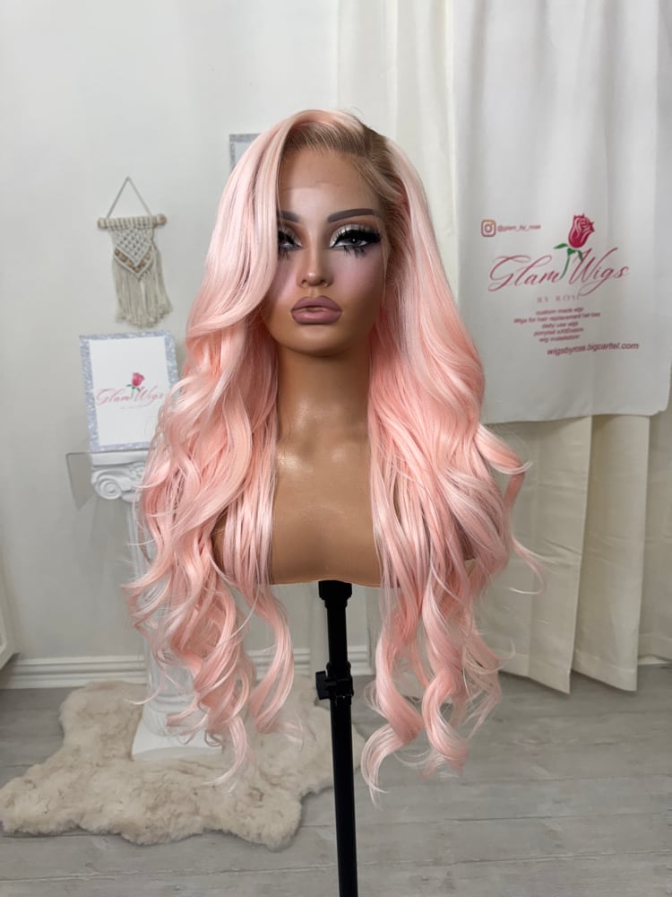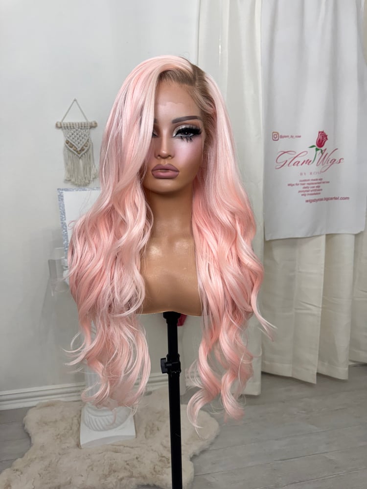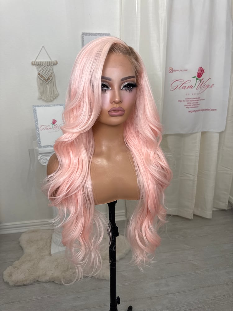 35 inches lace front t part glueless wig, hand painted smudge roots, One size fits all stretch breathable cap, beginner friendly glueless wig, soft realistic human Hair and synthetic blended fiber heat resistant up to 400° , best hair quality final sale item.