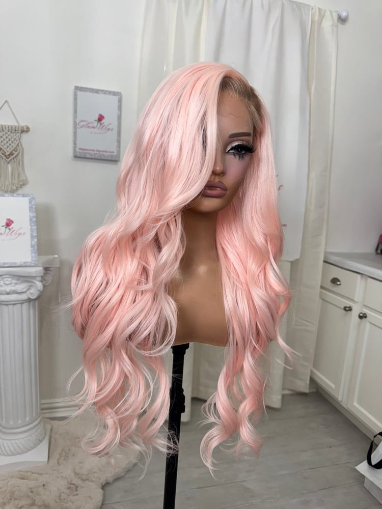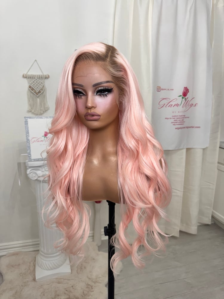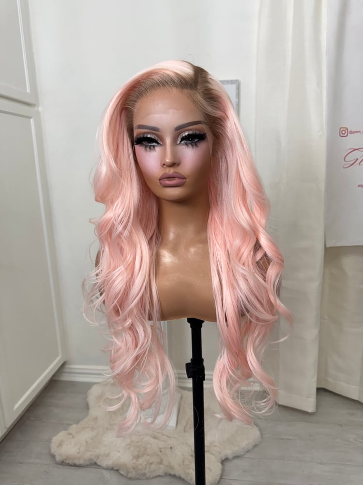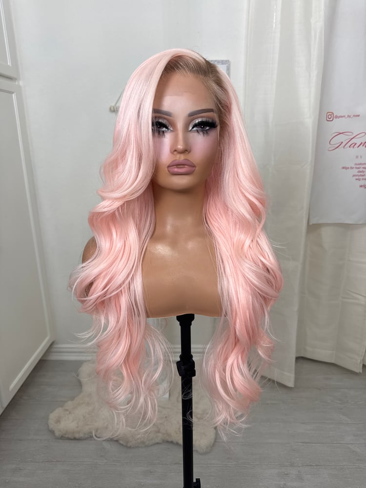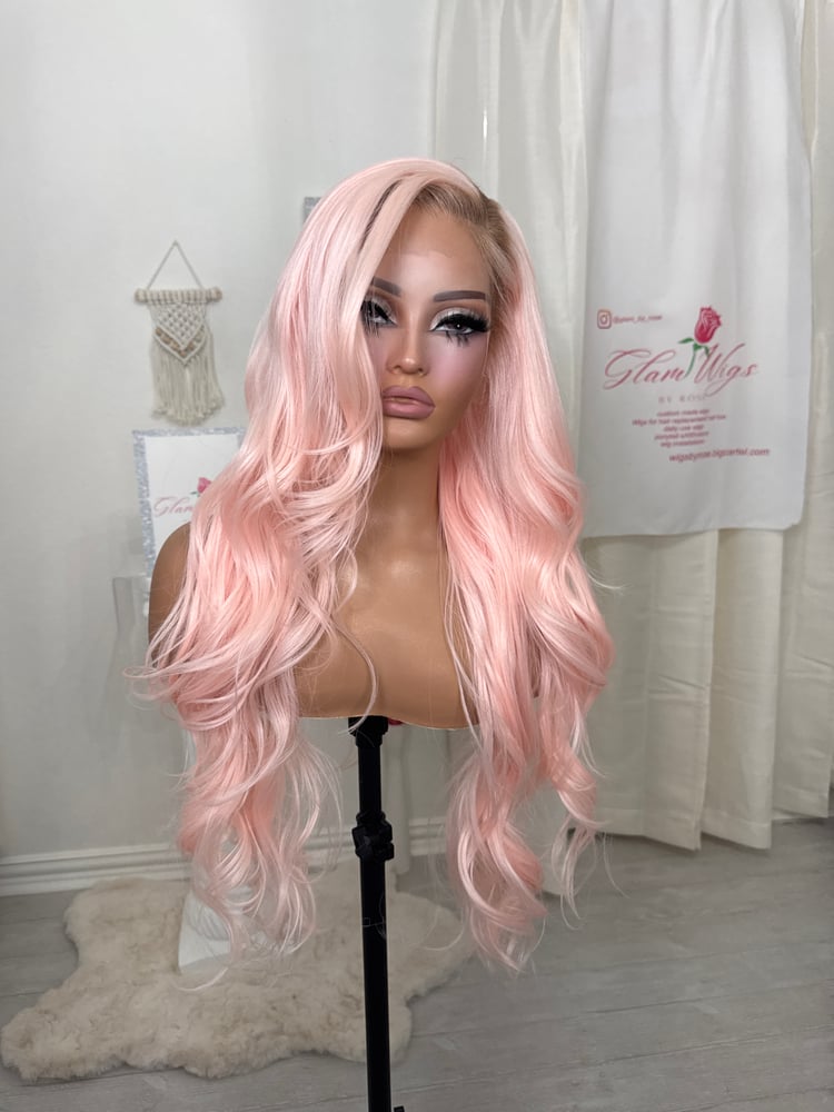 35 inches lace front t part glueless wig, hand painted smudge roots, One size fits all stretch breathable cap, beginner friendly glueless wig, soft realistic human Hair and synthetic blended fiber heat resistant up to 400° , best hair quality final sale item.