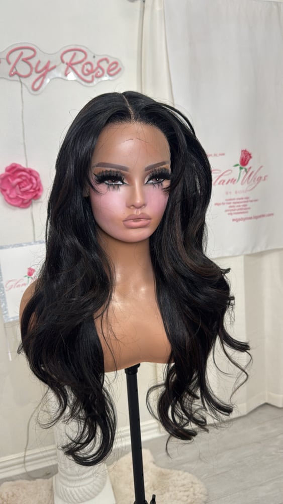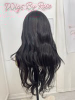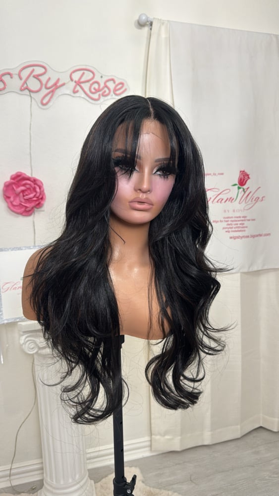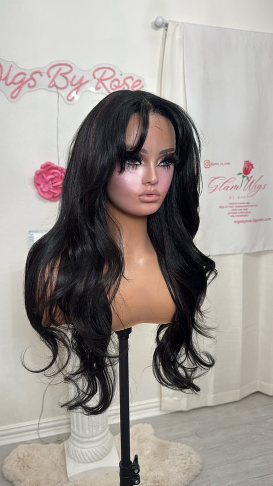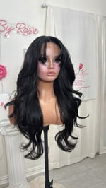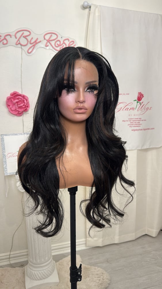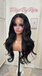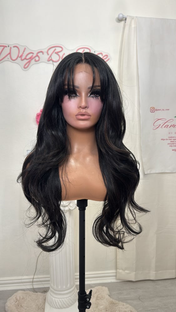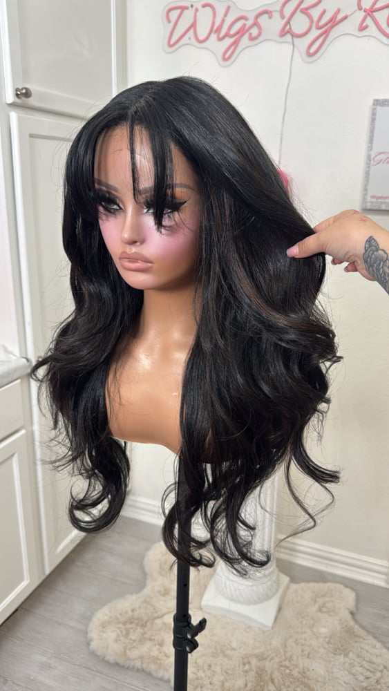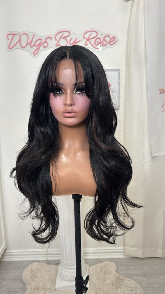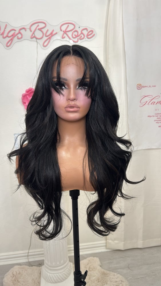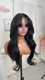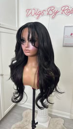 T part lace front glueless wig, hand plucked natural hairline, luxury synthetic and human hair blended fiber, heat restant up to 400, one size fits all stretch breathable cap, adjustable straps and combs, 28 inches with layers and curtain bangs, final sale item.