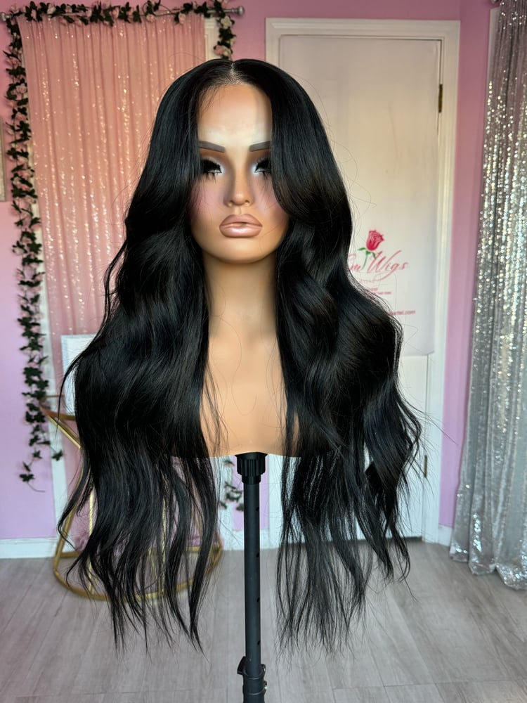 Free part lace front HD pre cut lace, 28 inch glueless wig human hair and synthetic blended luxury natural fibers, elastic adjustable removable band inside along with combs final sale item