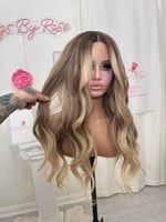 Best seller !!! Balayage premium luxury blended with human hair wig 24 inches lace part wig, wig has lace only down the center parting space. Wig comes with tape to stick down the lace after cutting off excess lace for most natural look, use of tape is optional. heat resistant up to 400° no glue needed easy to use beginner friendly