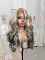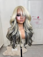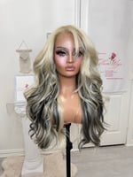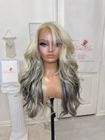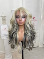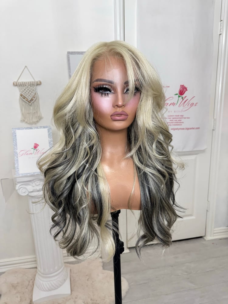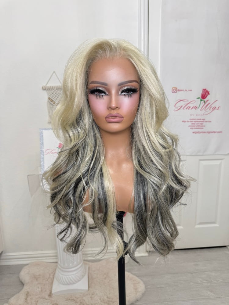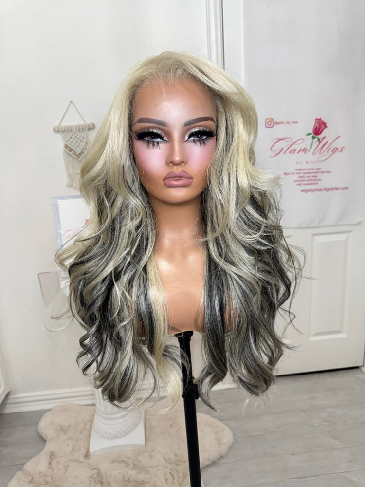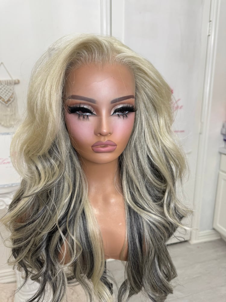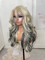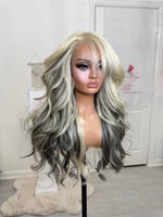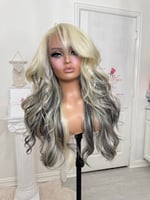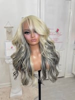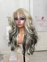 T part lace front glueless wig with hand plucked natural hairline, 26 inches, face framing layers, luxury human hair and synthetic blended fiber one size fits all stretch breathable cap, heat resistant up to 400° combs and adjustable straps inside. Final sale item.
