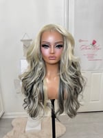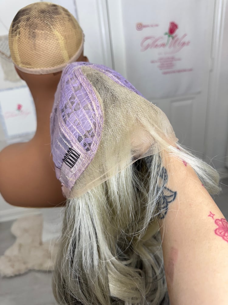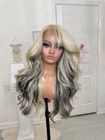 26 inches t part pace front glueless wig, Human hair and synthetic blended luxury fiber, soft natural realistic hair texture, heat resistant up to 400° stretch one size fits all breathable cap, combs and adjustable straps, final sale item.