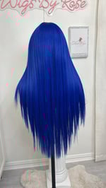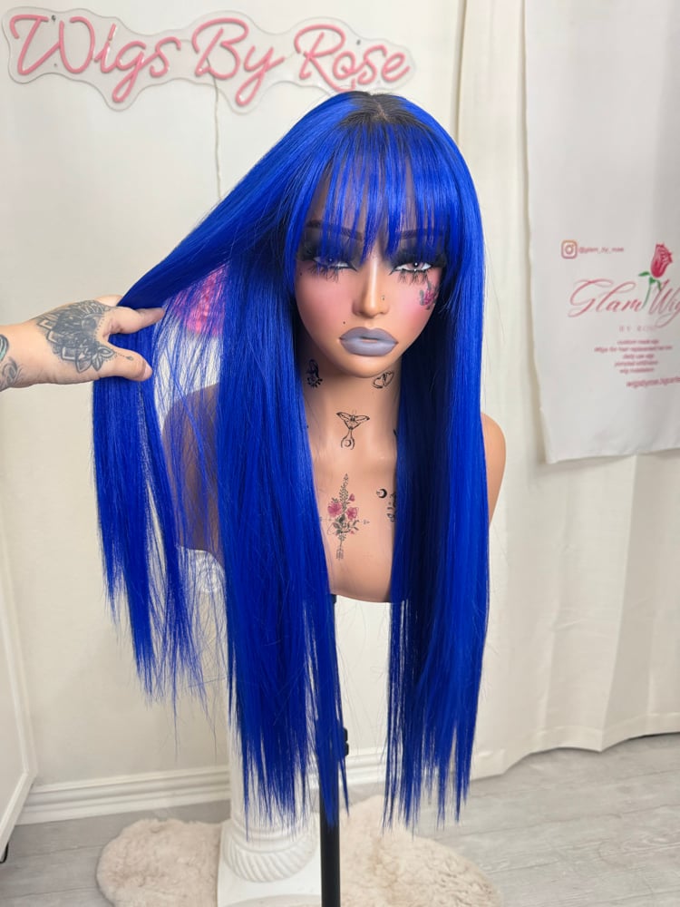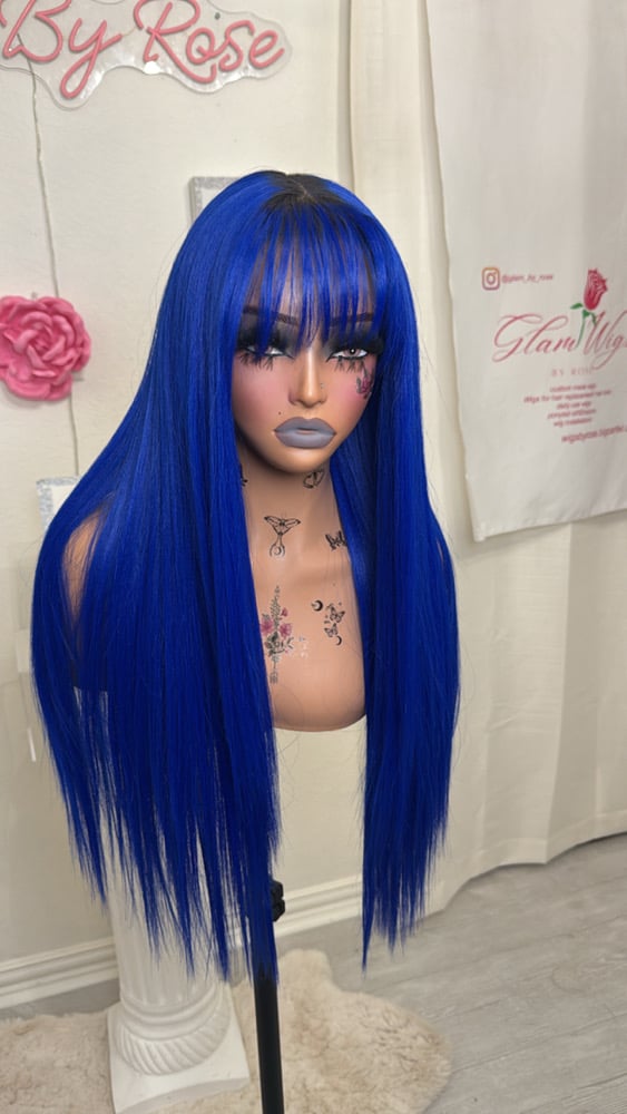 T part lace front glueless wig with hand painted smudge roots, human hair and synthetic blended luxury fiber for most realistic and natural hair texture. One size fits all stretch, breathable cap with adjustable straps inside wispy cut bangs heat resistant up to 400° final sale item.