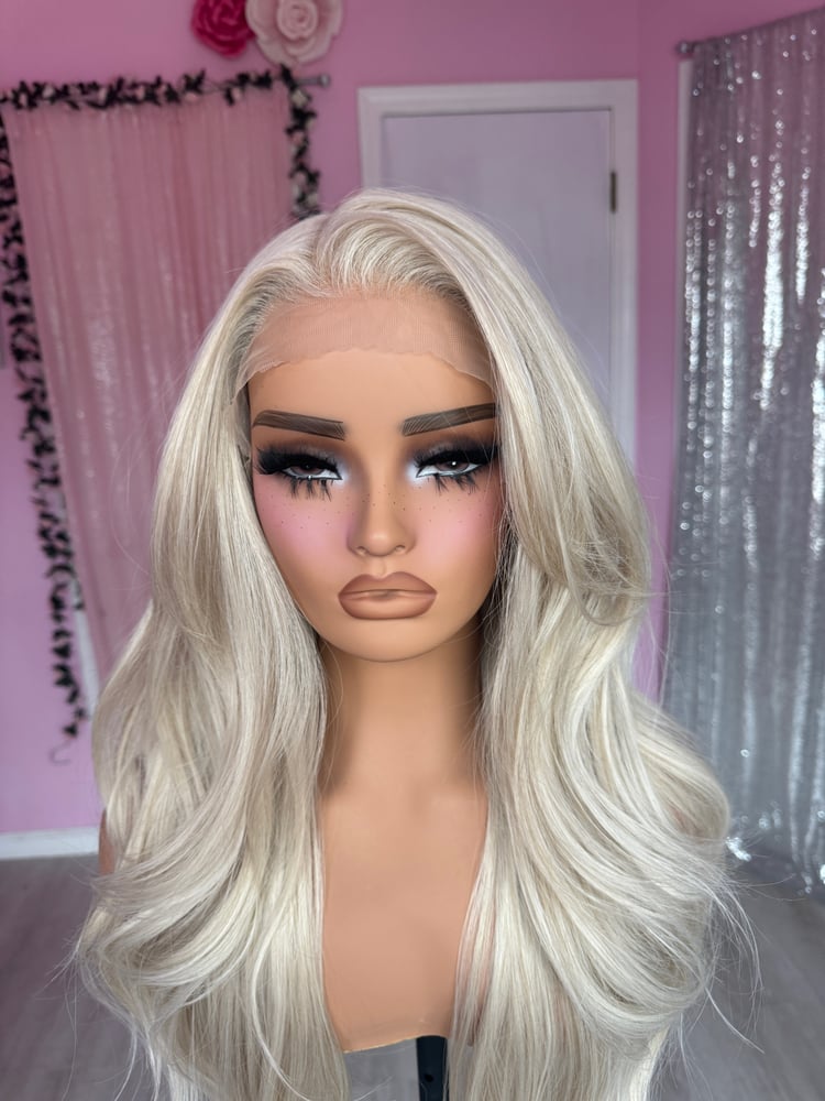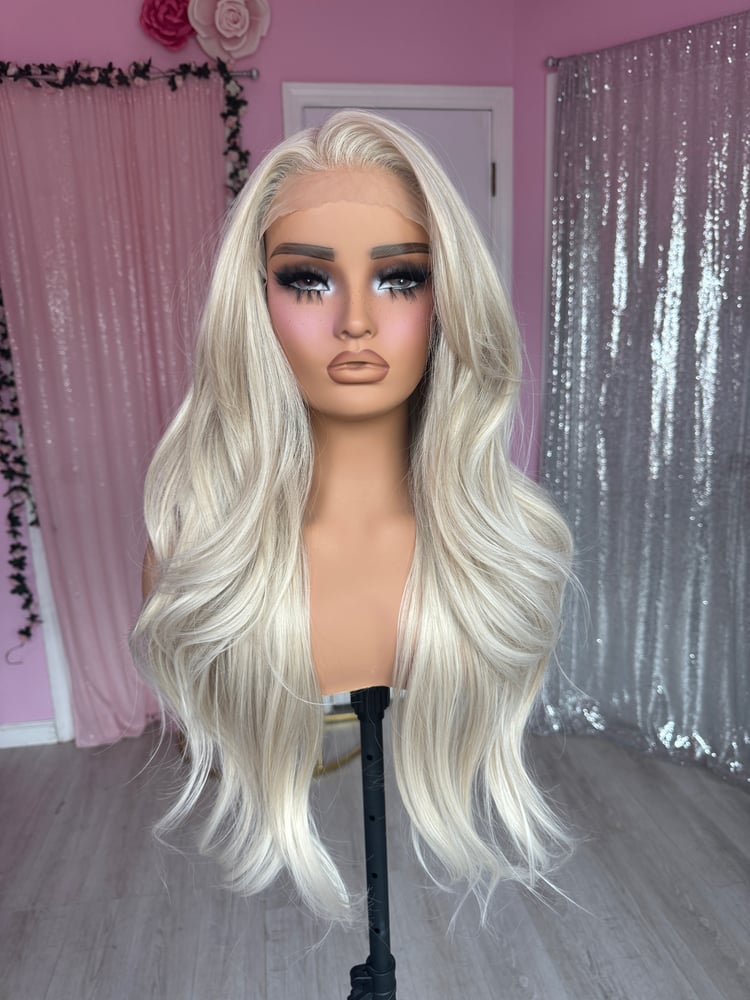 28 inch free part lace 13x6 frontal Glueless wig with glueless band inside as well as adjustable straps and combs human hair and synthetic hybrid luxury fiber for most realistic look and feel heat resistant up to 400° wig is lightweight and breathable. finale sale item , pre order takes 2 weeks to receive