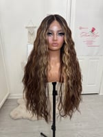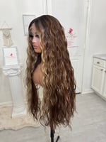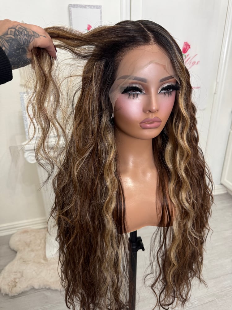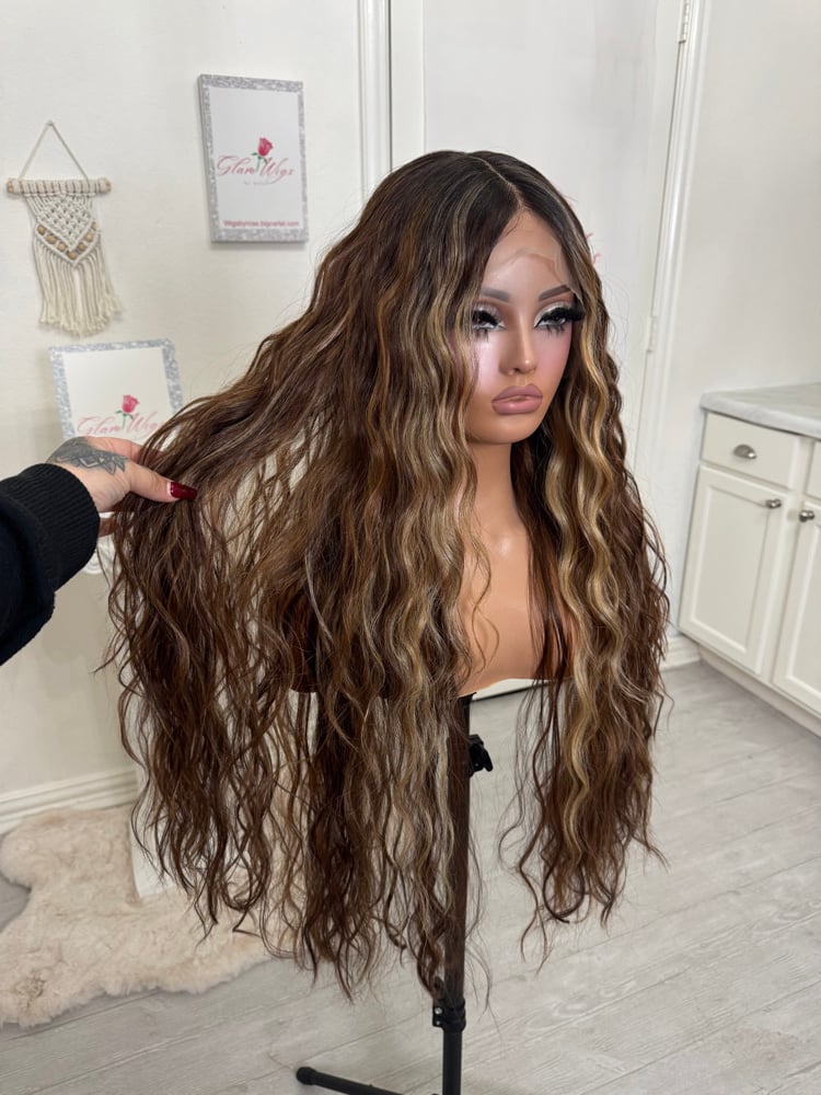 33 inches t part lace front glueless wig, 190 density Synthetic and human hair blended luxury fiber, heat resistant up to 400 soft natural hair texture stretch, one-size-fits-all cap with combs and adjustable straps, finale sale item