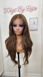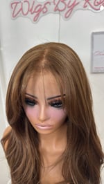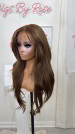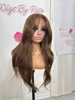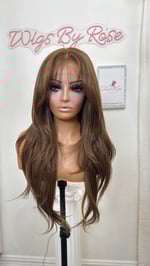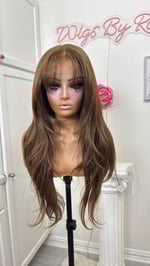 Free part 8x6 glueless lace front wig hand plucked natural hairline wispy cut curtain bangs and face framing layers, human hair and synthetic luxury blend, most realistic and natural hair texture heat resistant up to 400° one size fits all stretch breathable cap with combs and adjustable straps and elastic band. 28 inch length final sale item.