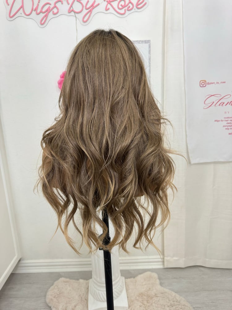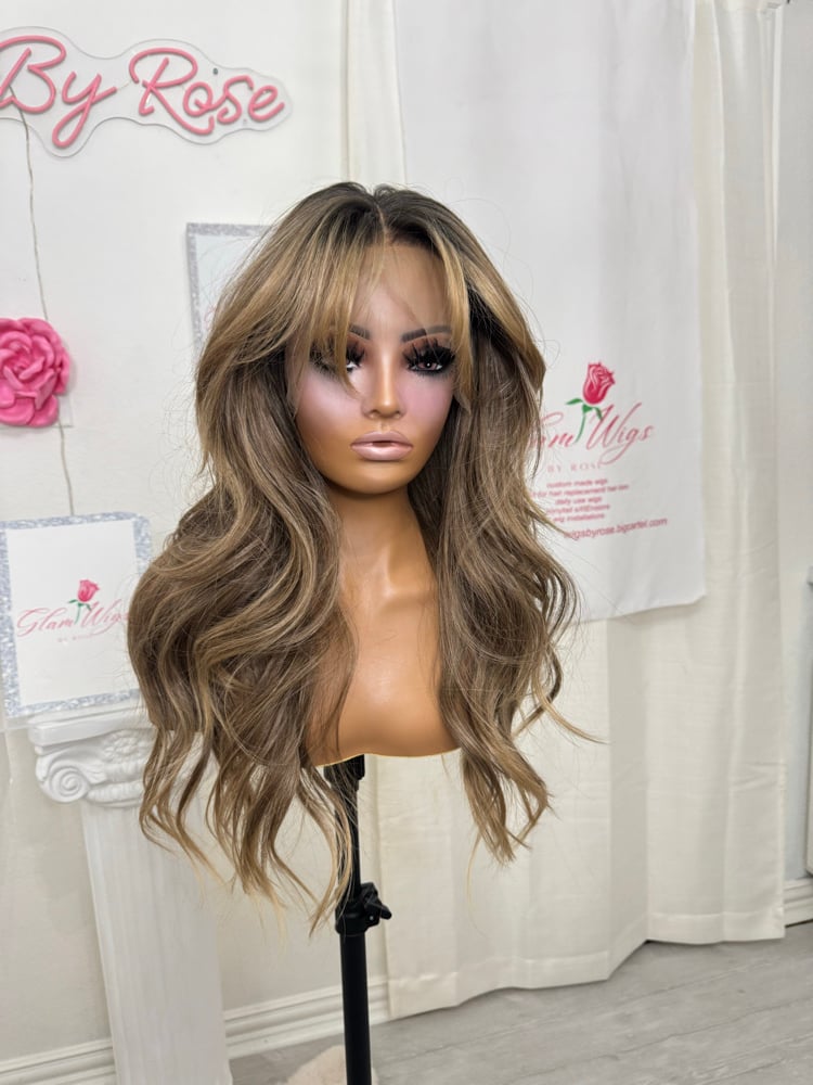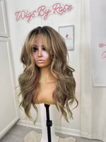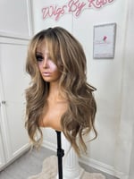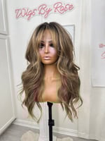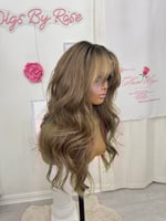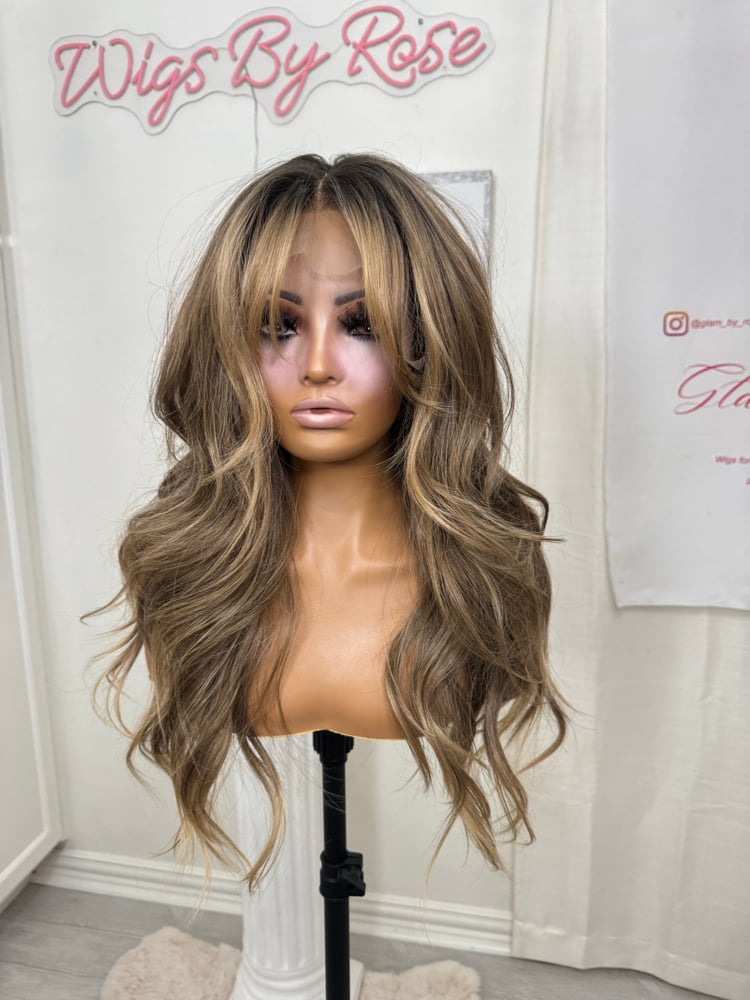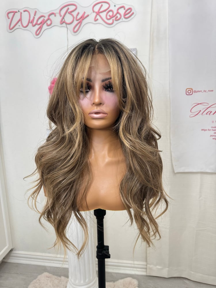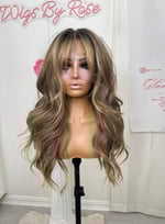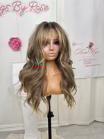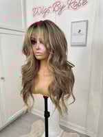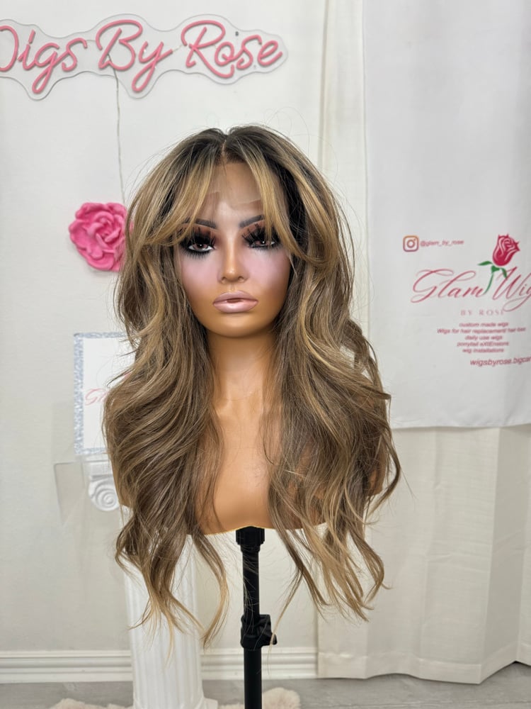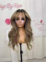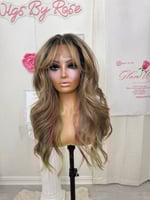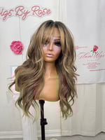 13x4 lace front glueless wig, hand plucked natural hairline, one size fits all stretch cap, lots of layers and volume, luxury synthetic heat restant finer, heat restant up to 400, 26 inches with wispy cut curtain bangs and layers, adjustable straps and combs, final sale item.