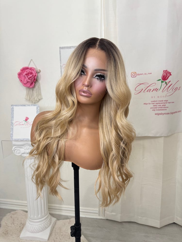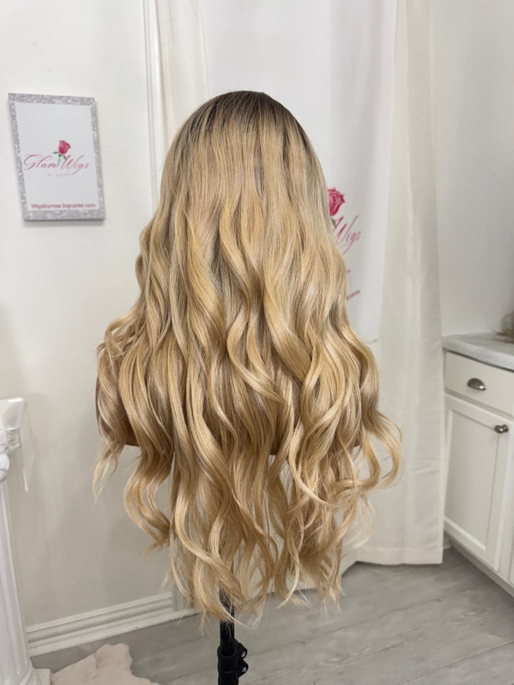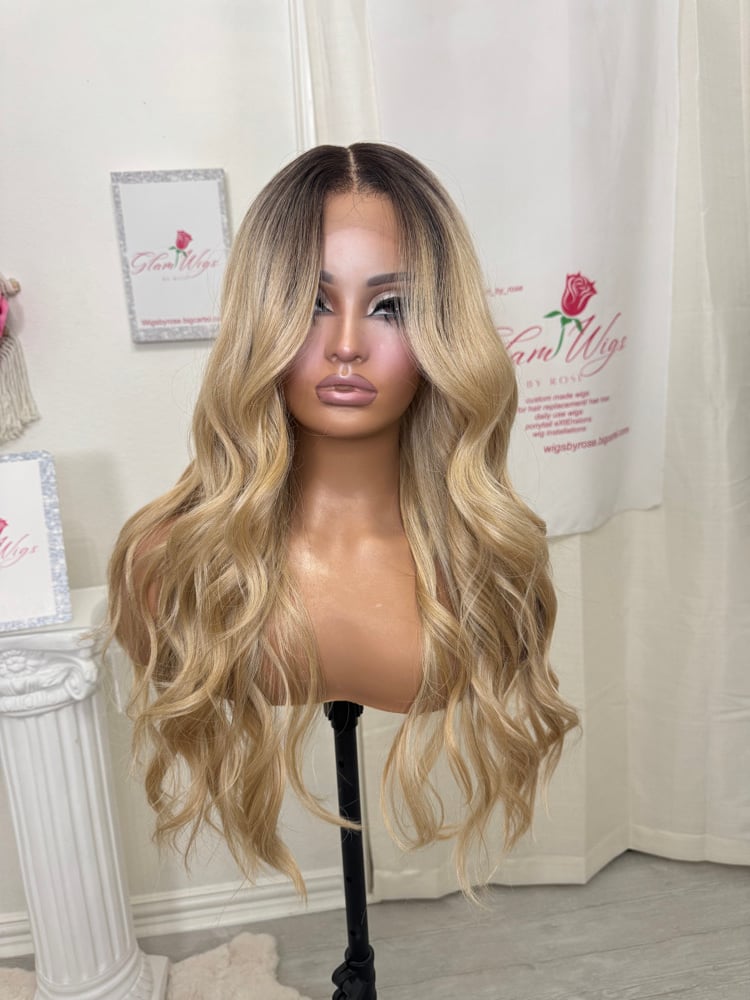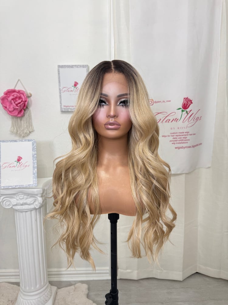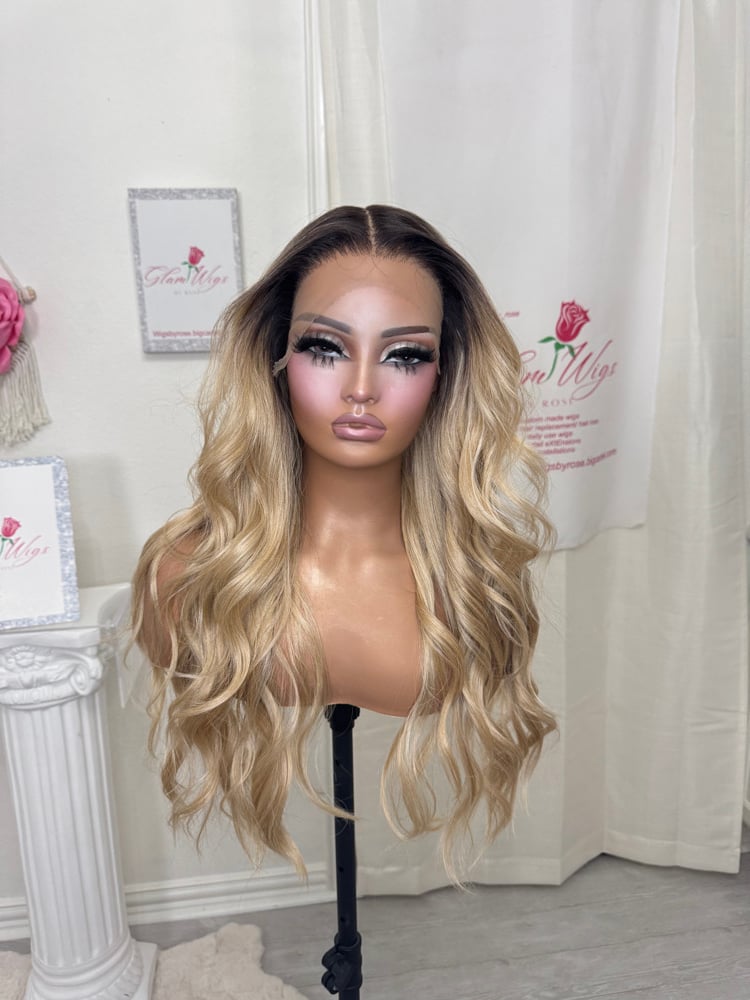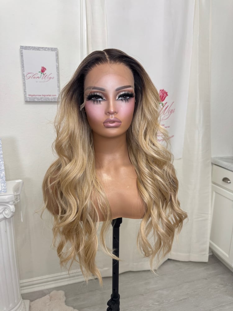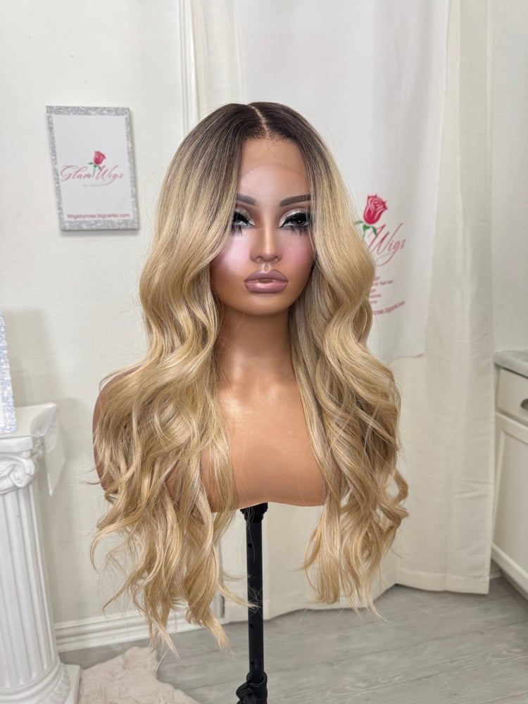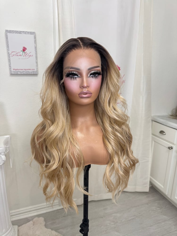T part lace front glueless wig hand plucked hairline, synthetic and human hair luxury blended fiber heat restant up to 400 soft natural hair texture, one size fits all stretch breathable cap with combs and adjustable straps, 26 inches . Final sale item .