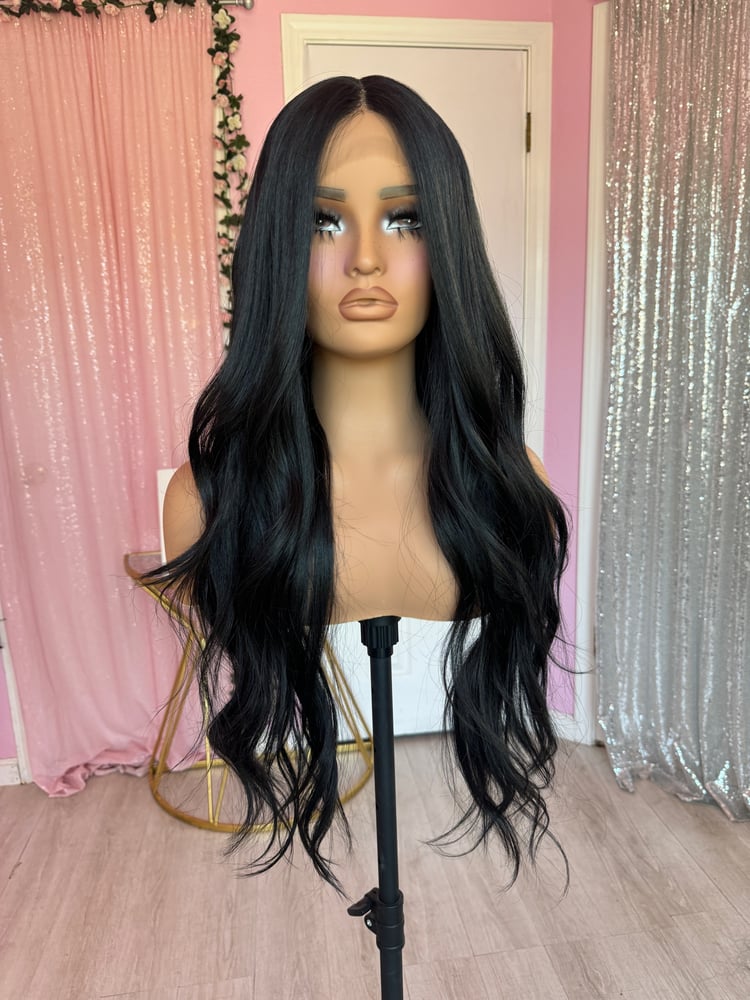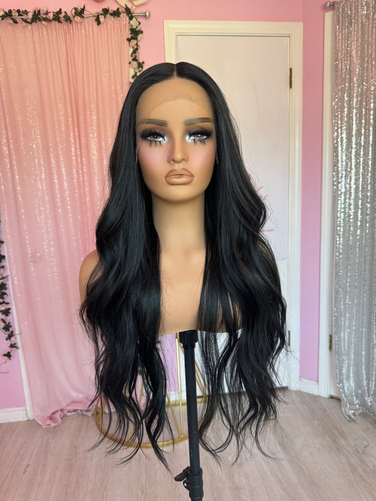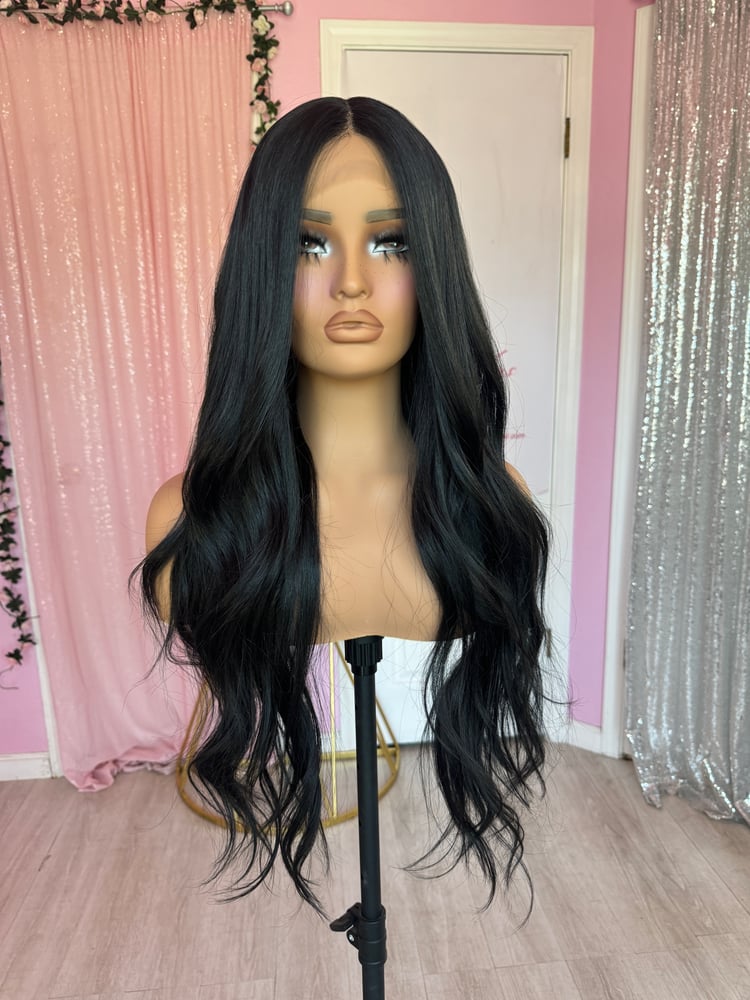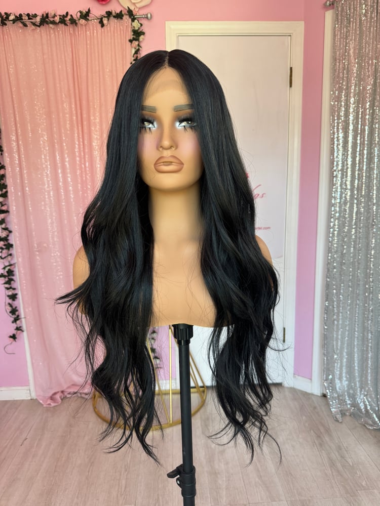 28 inches Hd natural lace plucked hairline t part lace glueless wig human hair and synthetic luxury blended fiber heat resistant up to 400° combs and adjustable straps inside one size fits all stretch breathable cap, Wig can be shifted to side for a side part. Final sale item