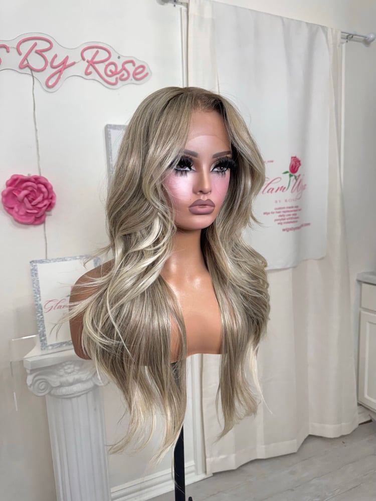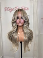 13x6 lace front free parting glueless wig with hand plucked natural hairline, One size fits all stretch breathable cap with adjustable straps and combs, luxury synthetic and human hair blended fiber for most realistic and natural hair texture heat resistant up to 400° , 26 inch length with face framing layers and wispy cut curtain bangs. Final sale item.