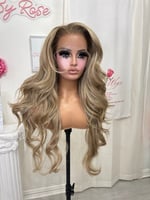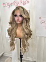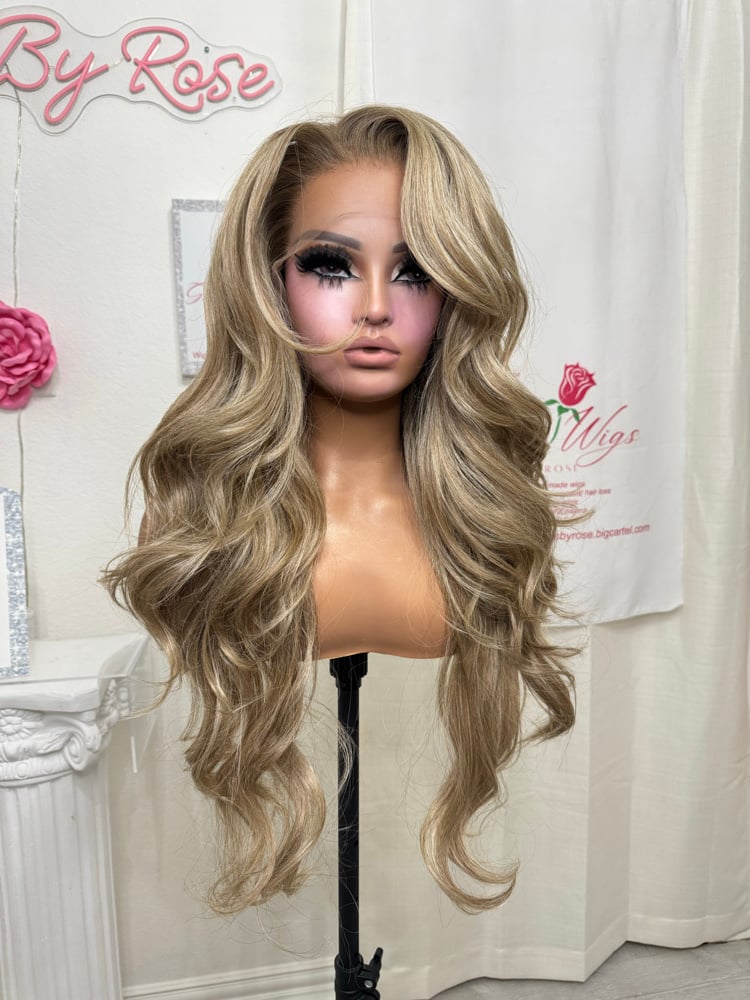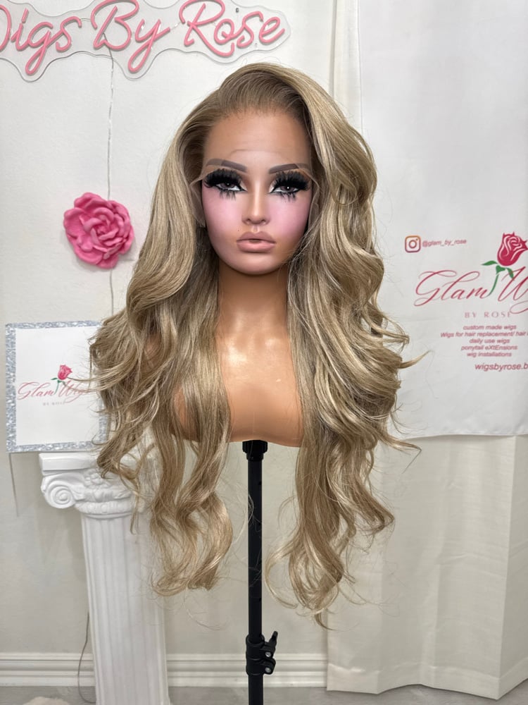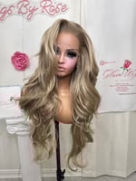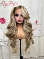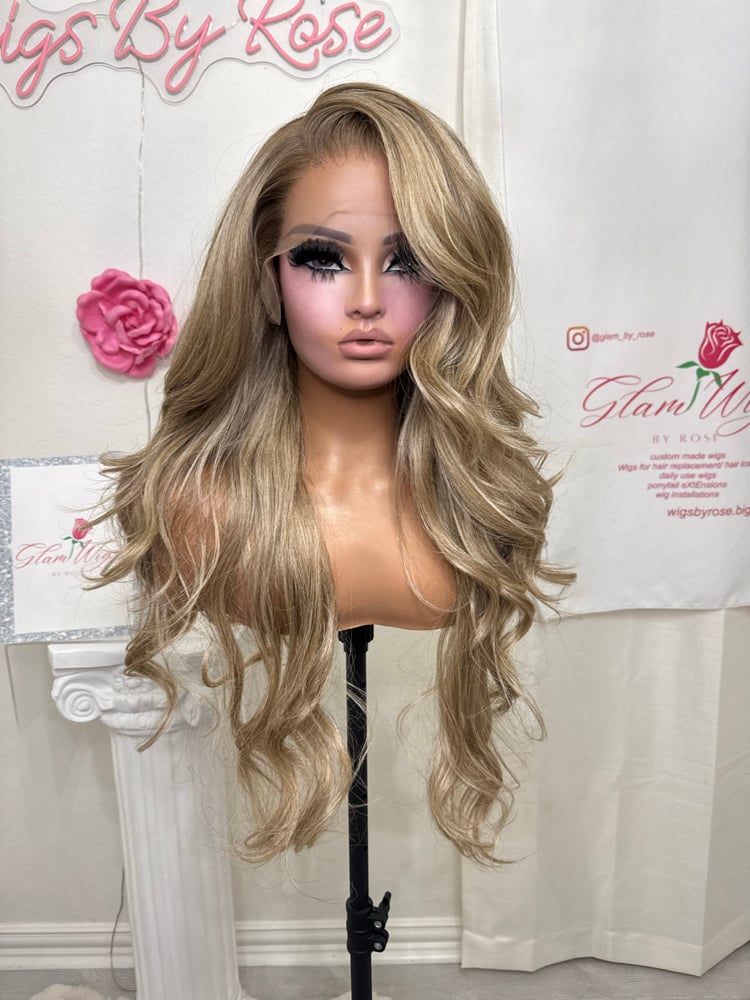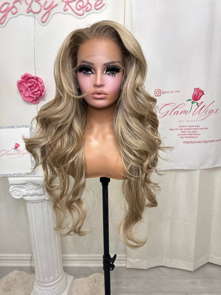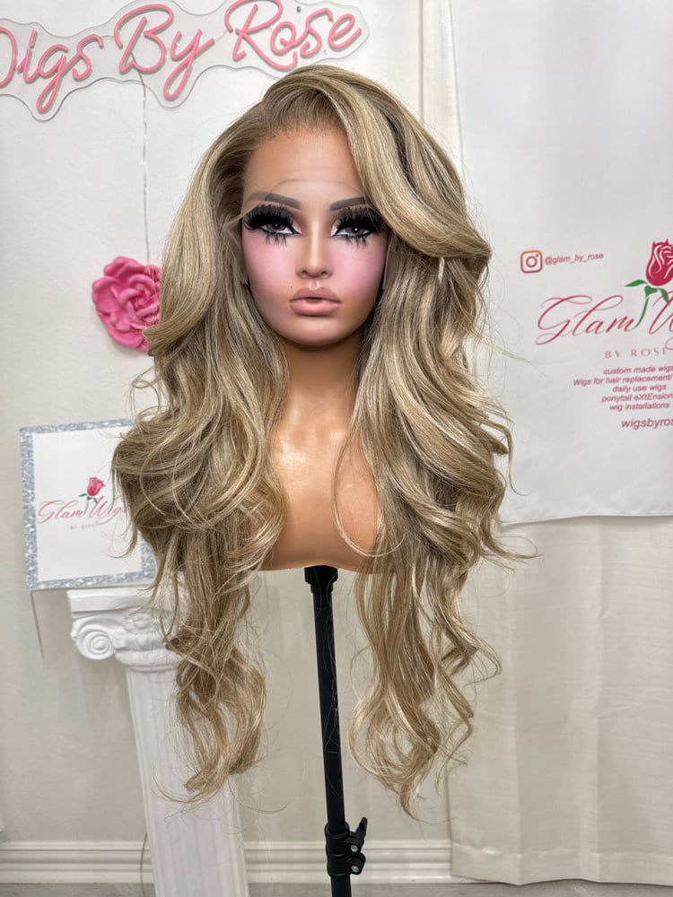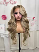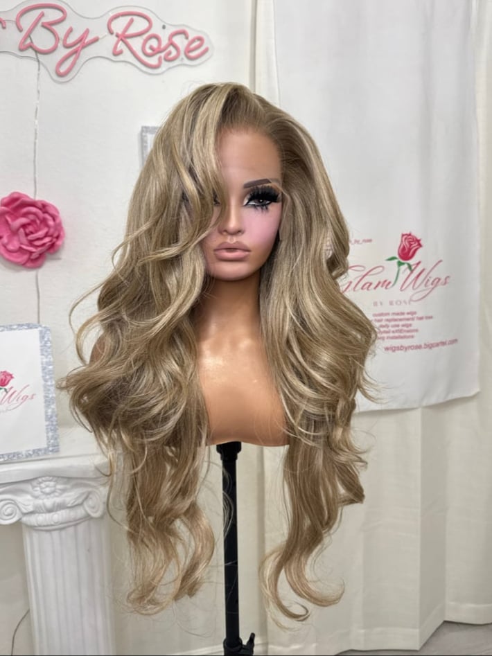 30 inches 13x6 luxury lace front free parting glueless wig, luxury human hair and synthetic blended fiber, most realistic and natural hair texture and cap construction, light transparent lace will match with any skin tone, heat resistant up to 400° one size fits all stretch breathable cap with combs adjustable straps and elastic band. Hand painted natural smudge roots, finale sale item.