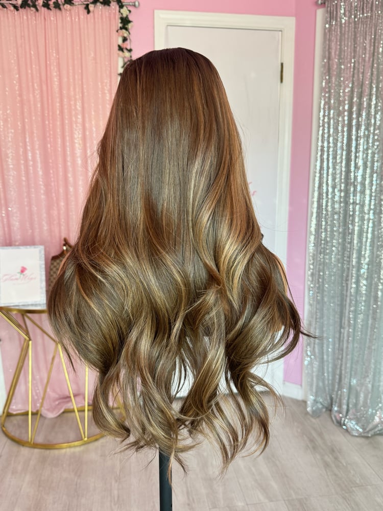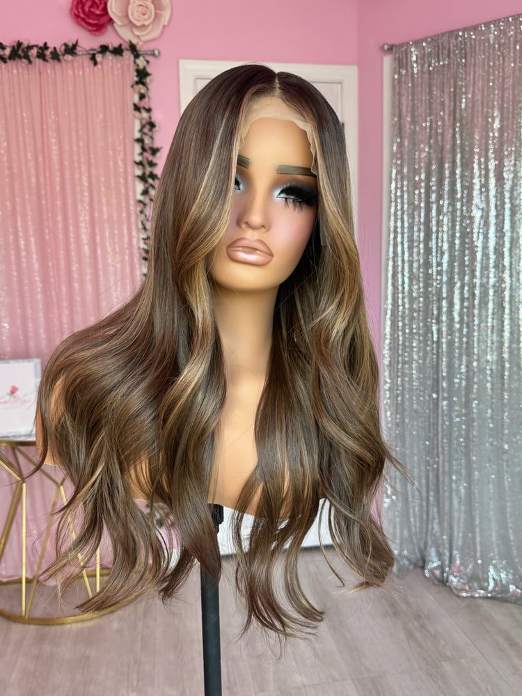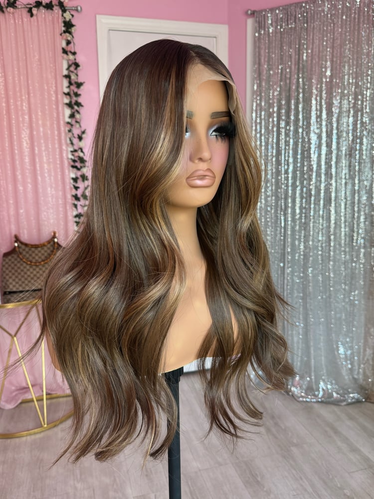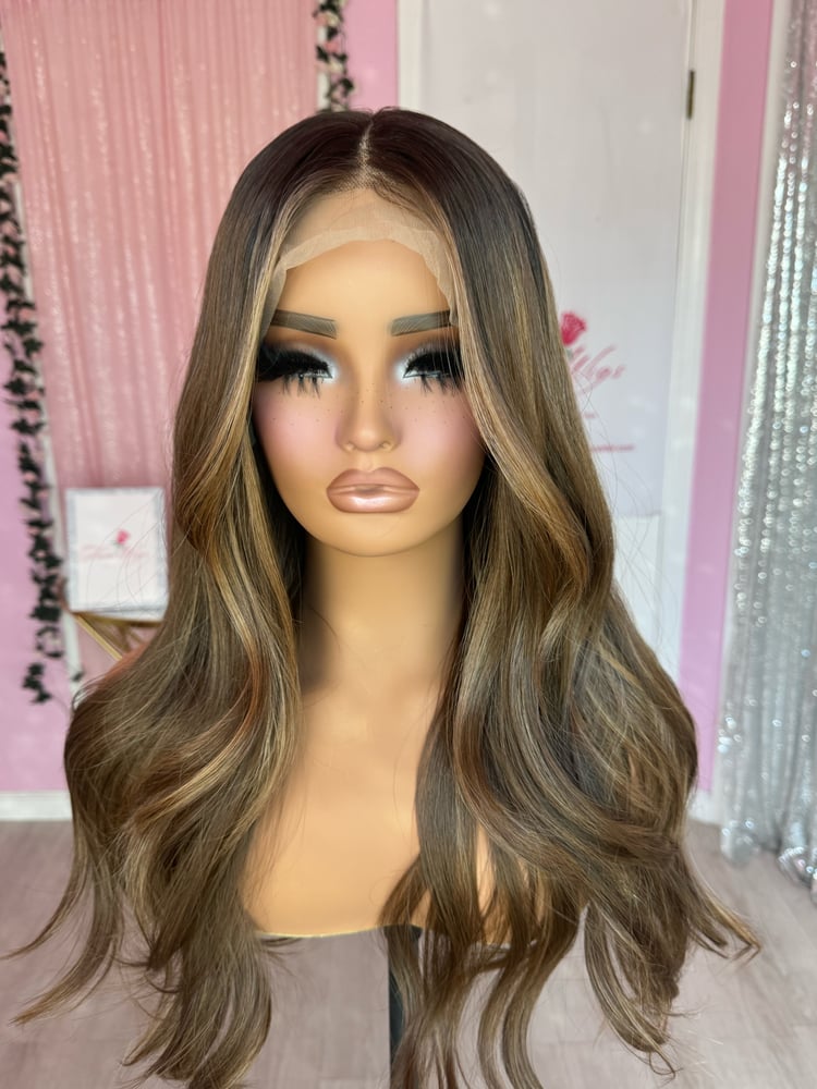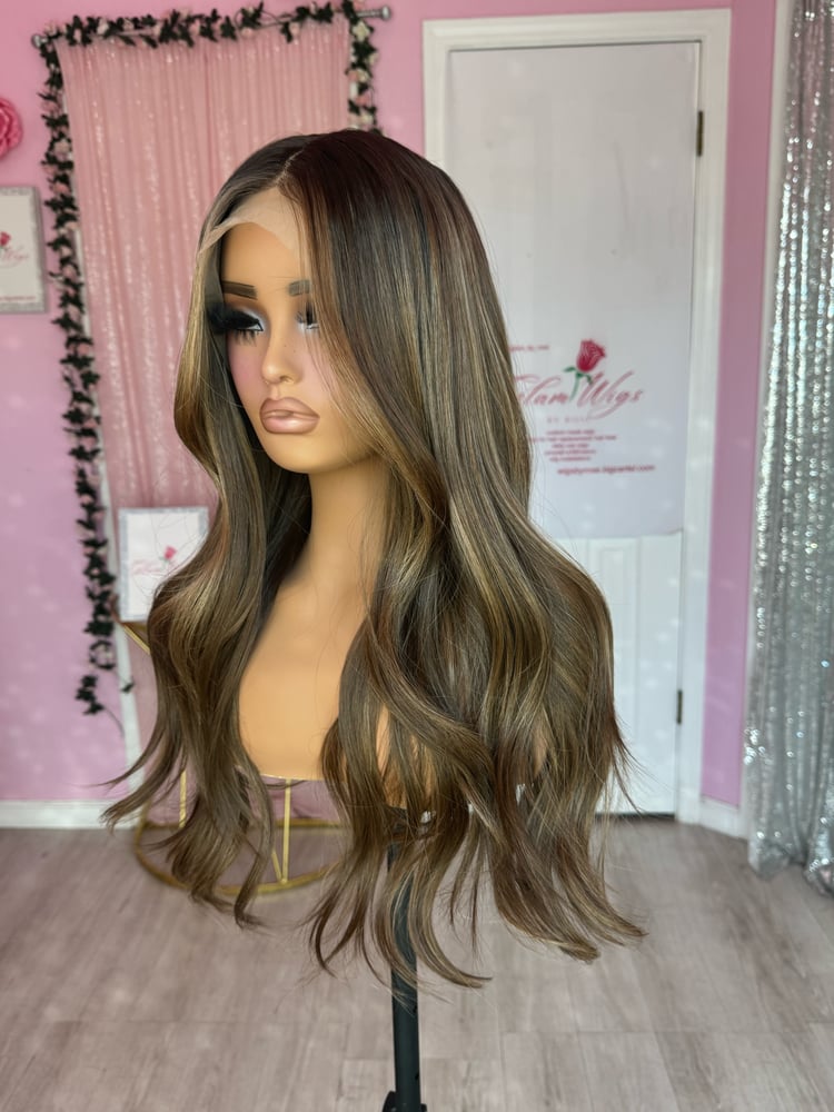 24 inch lace front glueless wig free part lace human hair and synthetic blended luxury fiber heat resistant up to 400° natural hairline, combs and adjustable straps inside final sale item
