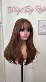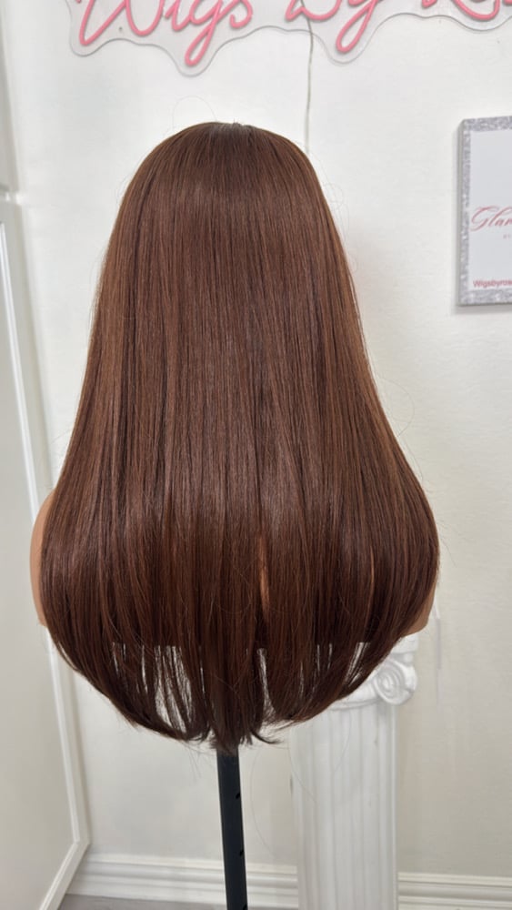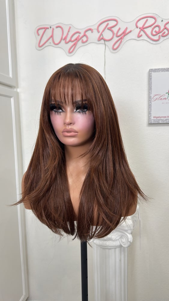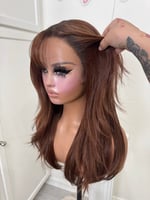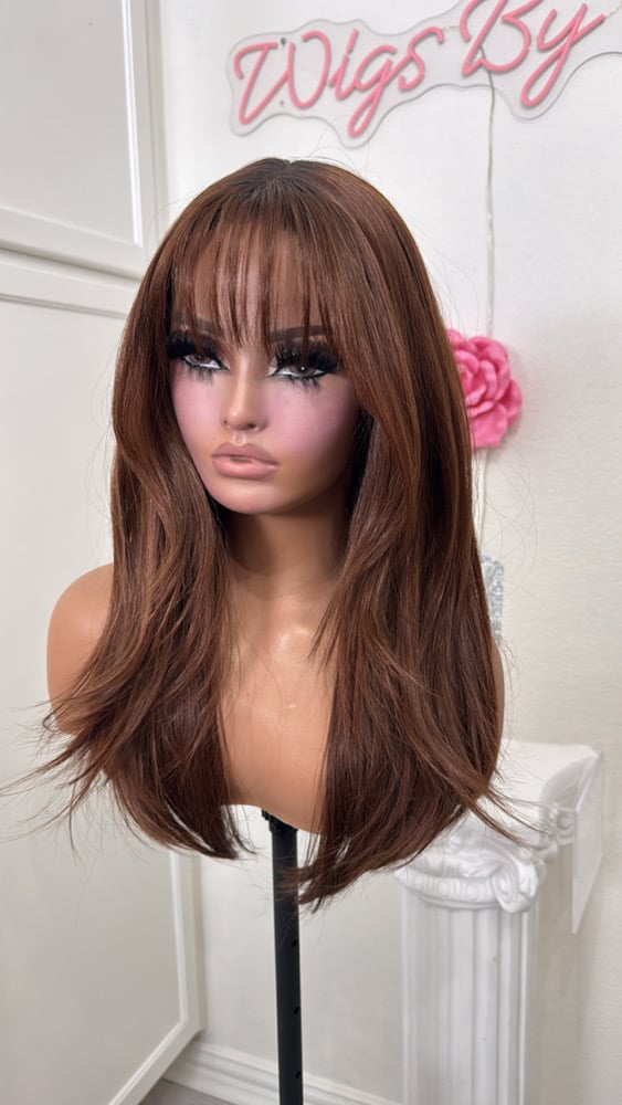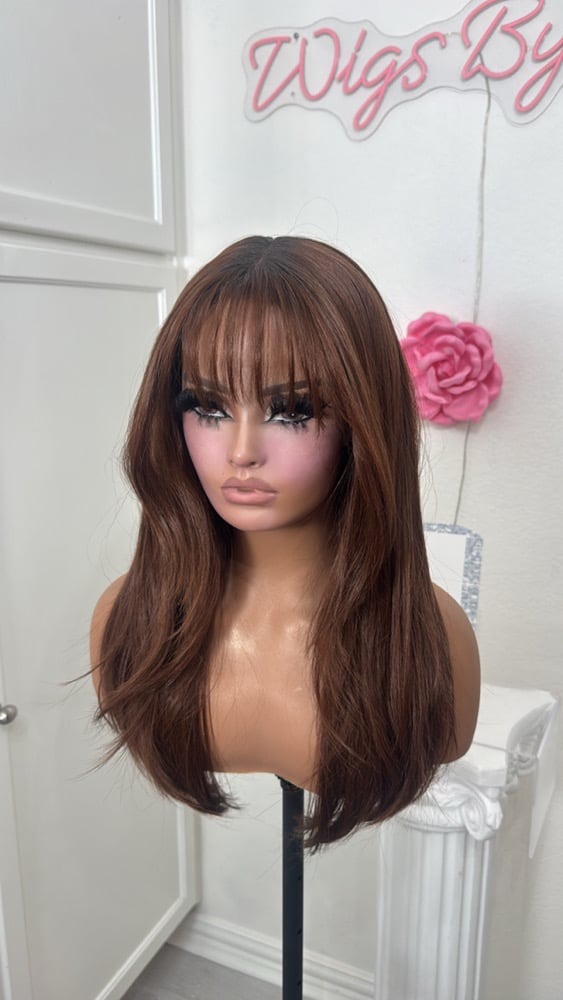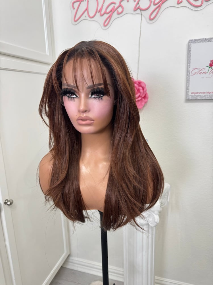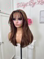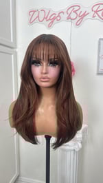 T part lace front glueless wig hand plucked natural hairline, hand painted smudge roots, one size fits all stretch breathable cap, luxury human hair and synthetic blended fiber most natural hair texture. Heat resistant up to 400° 20 inch length with wispy cut bangs and layers comb adjustable straps inside. Final sale item.