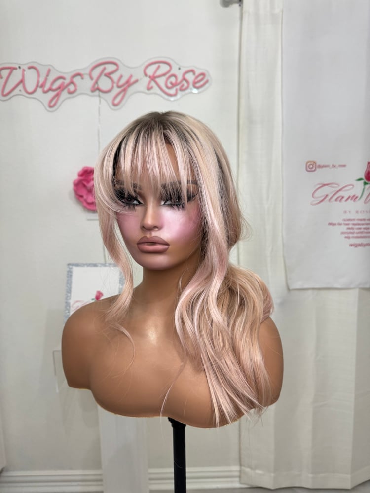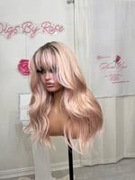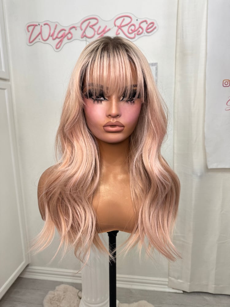 26 inches throw on and go pre cut lace wig, hand painted natural smudge roots, One size fits all stretch breathable cap ready to wear beginner friendly heat resistant up to 400° combs and adjustable straps inside luxury synthetic hair fiber. Final sale item.