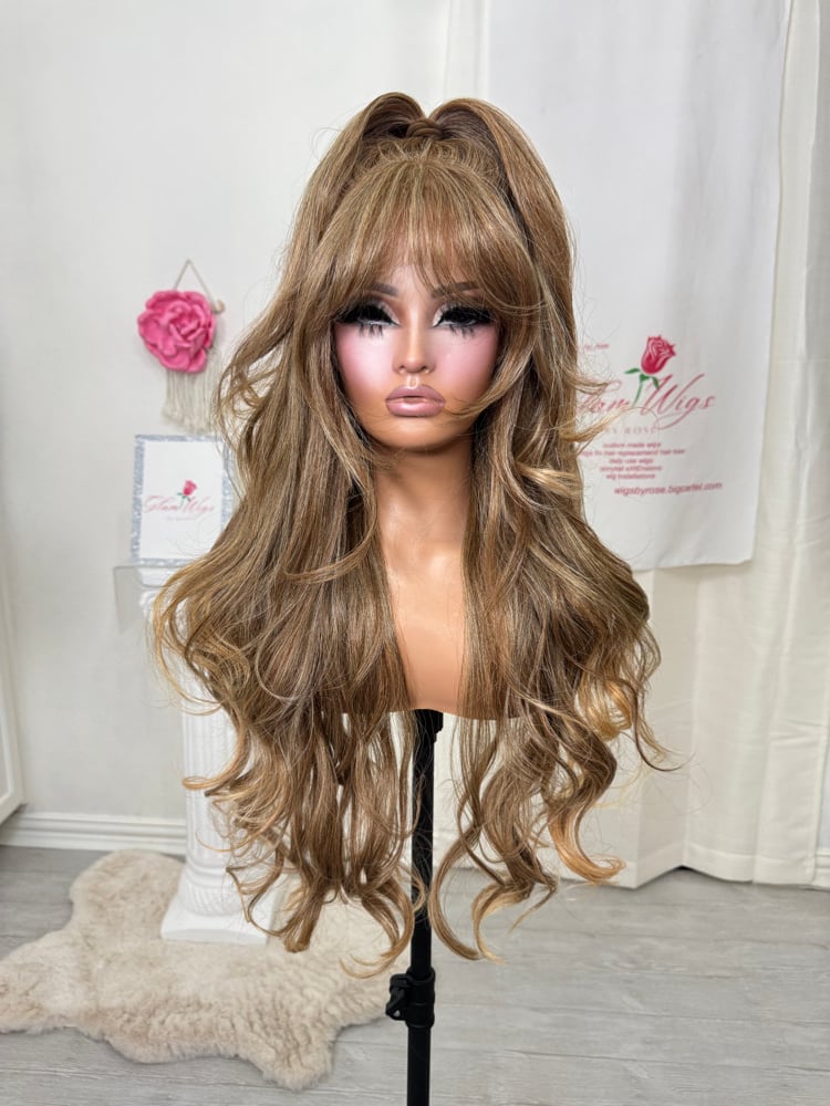 13x6 lace front free parting glueless wig, 35 inches with wispy cut bangs and layers , Synthetic and human hair blended luxury fiber, heat resistant up to 400° most realistic hair texture and plucked natural hairline, one size fits all stretch breathable cap with adjustable straps and combs with elastic band. Final sale item.